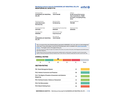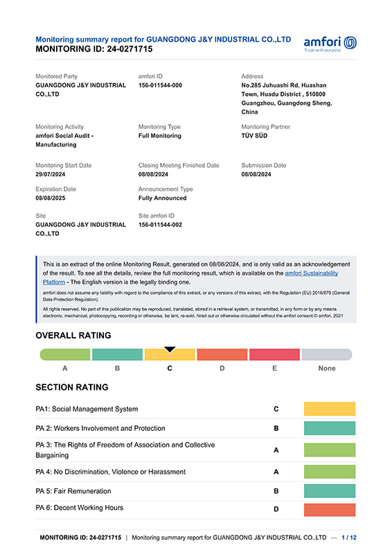 多家国际客户现场验厂,客户现场验厂一次性通过,进一步加强与国际客户的合作。通过了 Sedex, ISO9001 质量管理体系,成为客户的优质合作供应商。